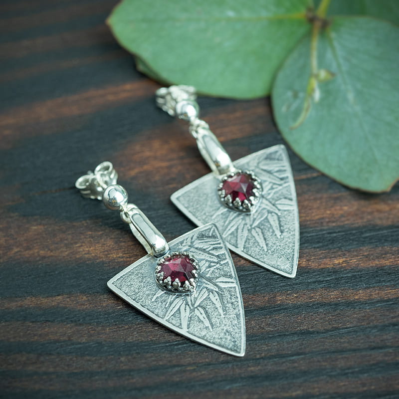 Srebrne kolczyki trójkąty z roślinnym wzorem i fasetowanym granatem