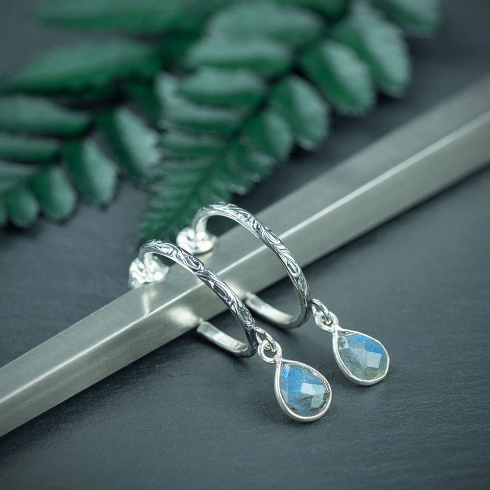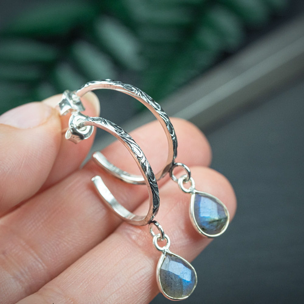 Subtelne i oryginalne kolczyki, które będziesz mogła założyć zarówno na oficjalne wyjście jak i luźne spotkanie ze znajomymi. Mają zaokrąglony, lekko owalny kształt i mocowane są na wygodne sztyfty. Powierzchnia zdobiona jest bardzo lubianym przez klientki, wzorem Flora. Na dole kolczyka zamocowana jest fasetowana łezka labradorytu. Kamień ma wyjątkowy, niebieski odcień, a dzięki drobnym fasetkom pięknie połyskuje.