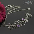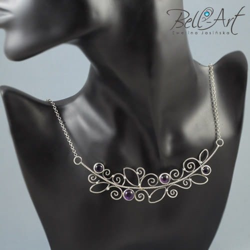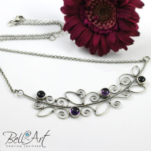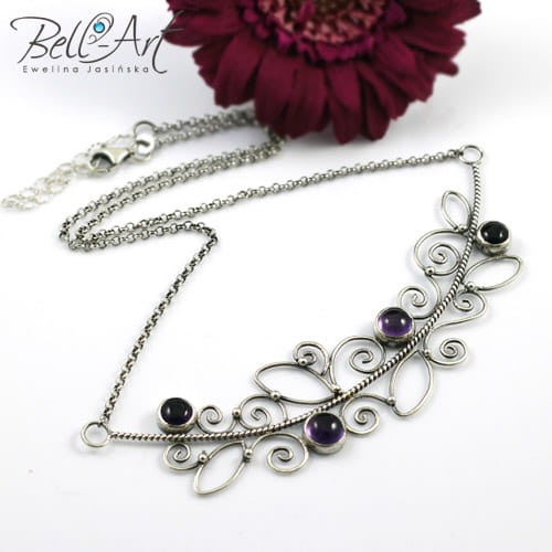 Ekskluzywny naszyjnik wykonany od podstaw ręcznie ze srebra próby 925 i 999. Ozdobiony niewielkimi, okrągłymi ametystami. Minerały posiada wyjątkową, głęboką barwę. Srebro jest oksydowane (przyciemnione) i wypolerowane na połysk. Ametysty zostały wkomponowane w ażurowy, misternie stworzony wzór przypominający gałązkę bluszczu. Całość zawieszona jest na delikatnym eleganckim łańcuszku z regulowaną długością. Naszyjnik będzie idealną ozdobą dla Pań które lubią eleganckie i wyszukane ozdoby.