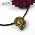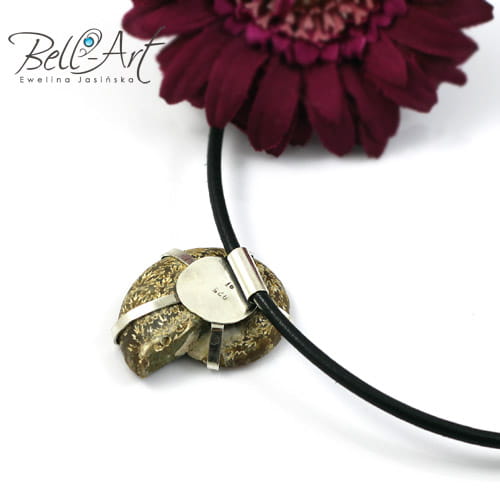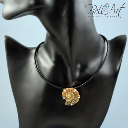 Wyjątkowy naszyjnik wykonany ze srebra próby 925 oraz dużego amonitu (skamieniała muszla). Amonit został bardzo lekko (ale stabilnie) oprawiony jedynie w srebrne łapki aby nie zakrywać jego wyjątkowej urody. Zawieszony na czarnym , skórzanym rzemieniu. Srebro jest delikatnie oksydowane (przyciemnione) i wypolerowane na połysk.
