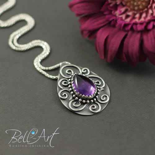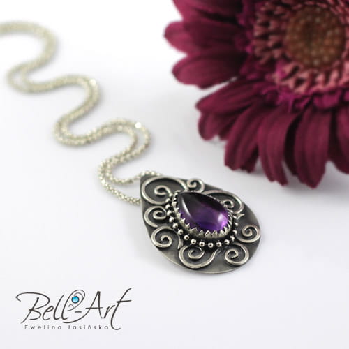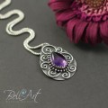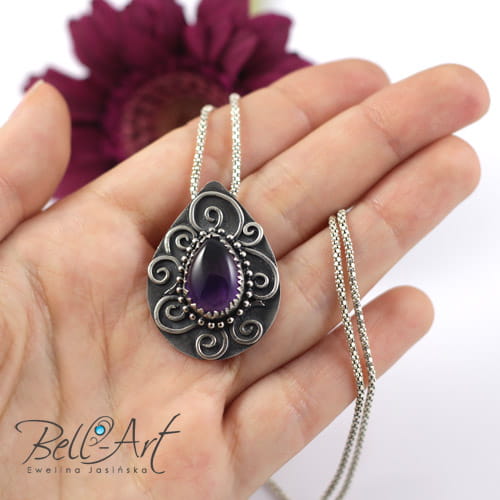 Piękny, duży wisior wykonany od podstaw ręcznie ze srebra próby 925 i 999. W środku połyskuje duży kaboszon ametystu (15×11 mm) zamknięty w ząbkowanej cardze i otoczony srebrnymi kuleczkami. Wokół ametystu umieszczone są delikatne zawijasy. Srebro oksydowane (przyciemnione) i wypolerowane w wypukłych miejscach na połysk. Tył wisiora został zmatowiony. Wisior jest elegancki i przyciąga wzrok misternym wykonaniem.