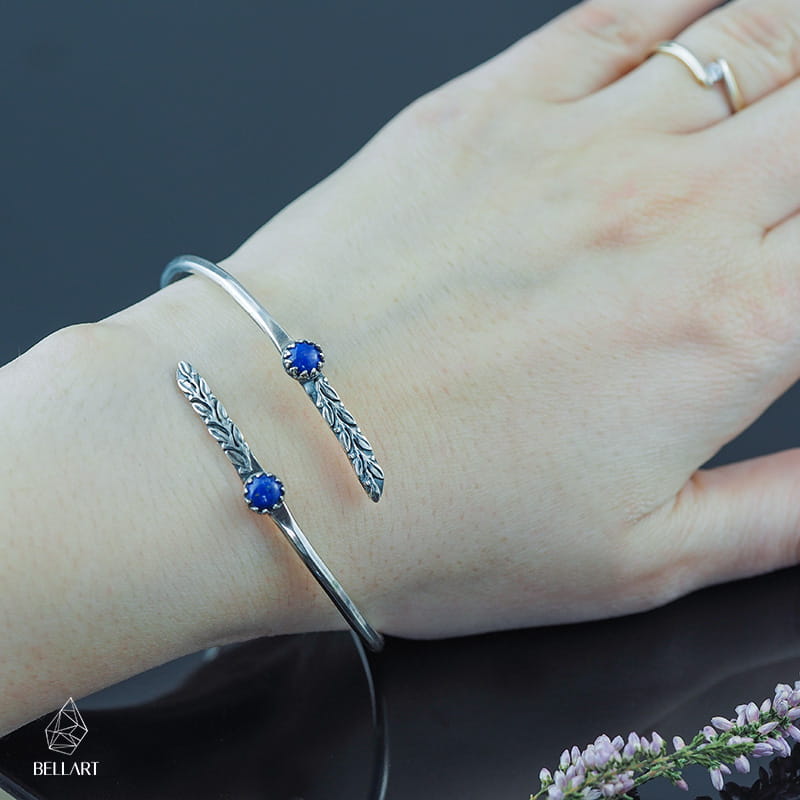 Piękna i kobieca bransoleta z lapis lazuli, wykonana ręcznie ze srebra. Ma ona postać owalnej bangli, której końce nie są złączone. Dzięki temu możesz dopasować ją do swojego rozmiaru. Bransoleta ślicznie prezentuje się zarówno na nadgarstku o obwodzie 15 cm jak i dużo większym. Końce bransoletki ozdobione zostały drobnymi listkami i lapis lazuli. Kamienie otoczone są koronkową oprawą co dodatkowo podkreśla romantyczny i kobiecy charakter ozdoby. Ten wzór bransoletki będzie idealnie łączył się ze stylem boho, lekkimi sukienkami czy ramoneską. Jeśli poszukujesz czegoś niebanalnego i efektownego ta srebrna biżuteria na pewno się sprawdzi.