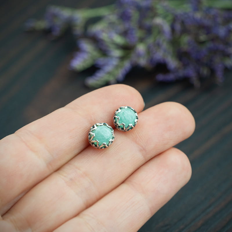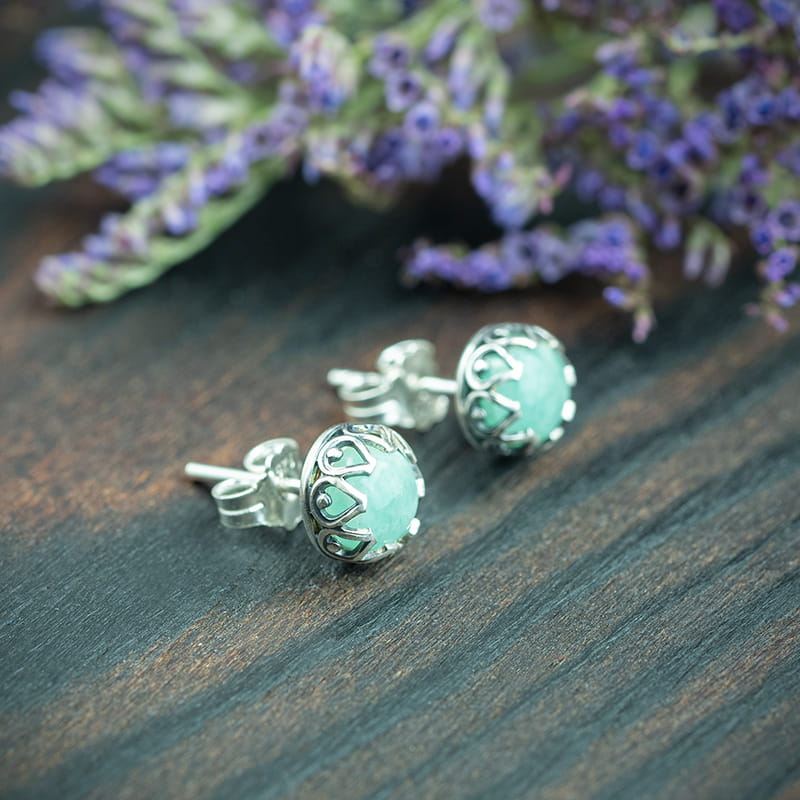 Aya - srebrne kolczyki sztyfty z amazonitem w ażurowej oprawie