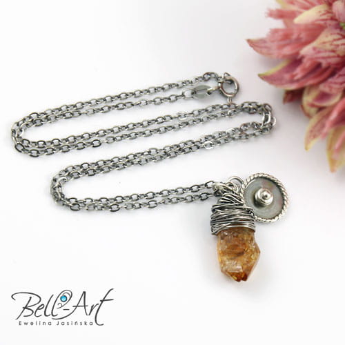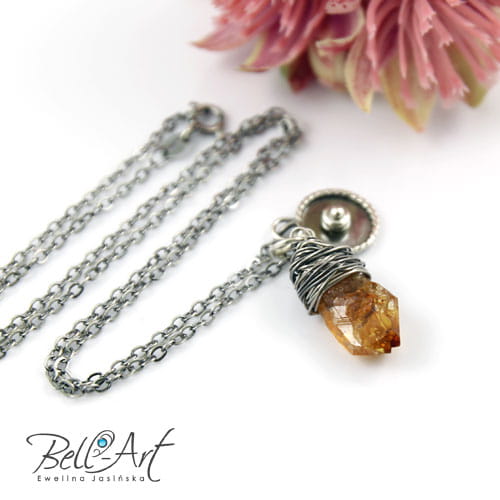 Efektowny naszyjnik wykonany ręcznie ze srebra. Jest on ozdobiony surowym kryształem cytrynu oraz ręcznie wykonaną zawieszką. Obydwie części idealnie ze sobą współgrają tworząc urokliwą ozdobę w stylu boho. Srebro zostało lekko przyciemnione (oksydowane) i wypolerowane na połysk. Naszyjnik jest ozdobą, która będzie pasowała do najmodniejszych stylizacji etno lub boho, ale też podkreśli każdy klasyczny ubiór.