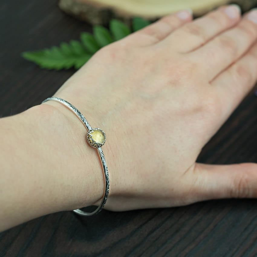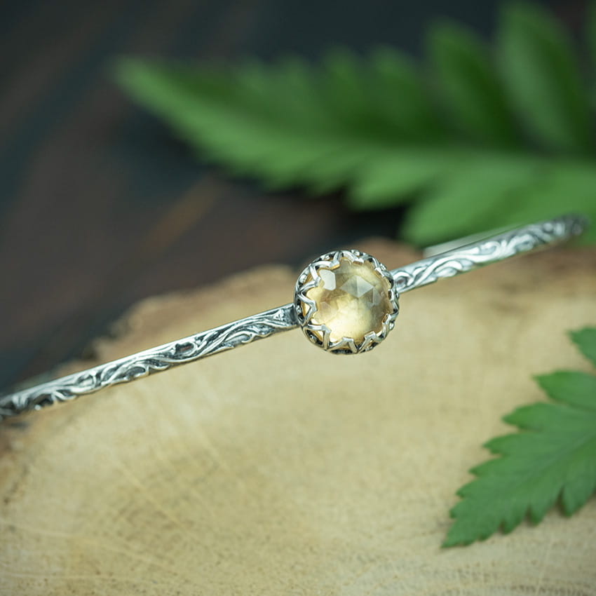 Misternie zdobiona srebrna bransoleta z fasetowanym cytrynem. Wykonana została ręcznie w mojej pracowni, przy użyciu technik złotniczych. Powierzchnię bransolety zdobią wypukłe zawijasy, które nadają całości finezji i elegancji. Fasetowany cytryn o pięknym szlifie rose cut delikatnie połyskuje i przyciąga wzrok. Bransoleta ma lekko owalny kształt dzięki czemu jest wygodna. Rozłączone końce sprawią, że łatwo ją założysz i delikatnie dopasujesz do nadgarstka. Bransoleta z cytrynem jest subtelna, ale efektowna. Spodoba się miłośniczkom klasyki, ale też kobietom lubiącym nieco orientalny styl.