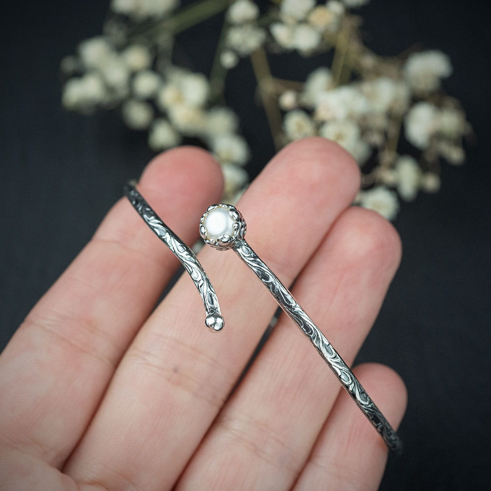 Srebrna bransoletka z wzorem flora i białą perłą na zamówienie Pani Julii