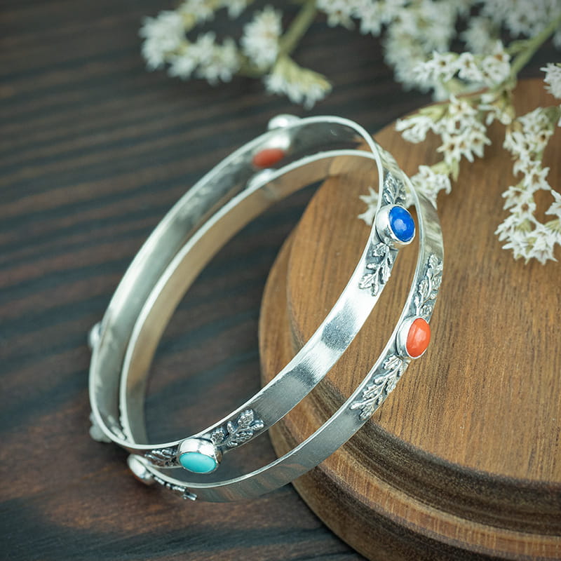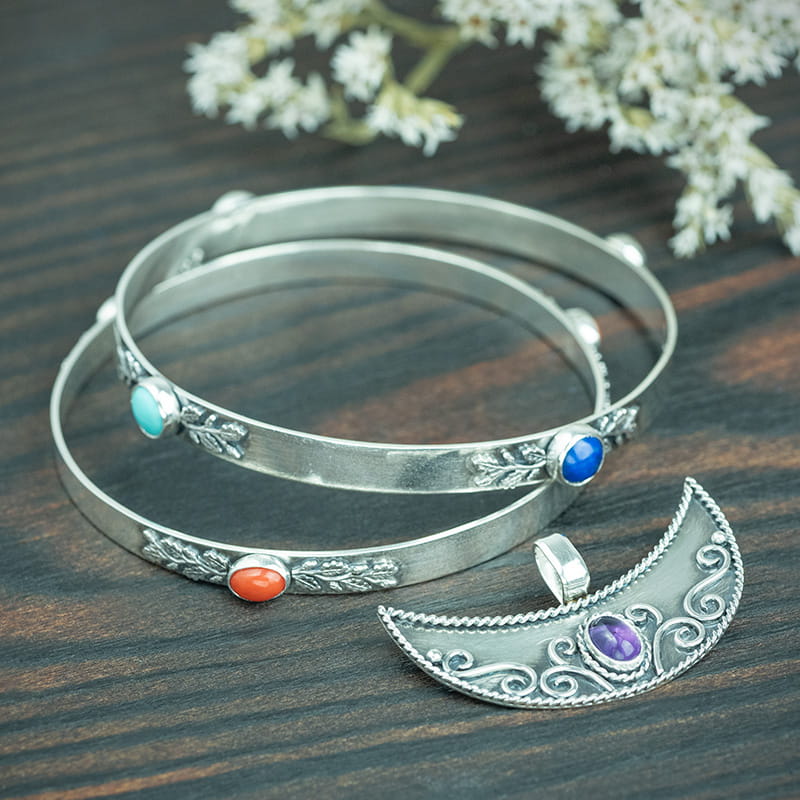 Wymiary: średnica wewnętrzna bransoletek 60 mm, szerokość ok. 4-6 mm, lapis lazuli 6 mm, turkus 6 mm, ametyst 5x7 mm, koral 4x6 mm, szerokość wisiora 4-5 cm