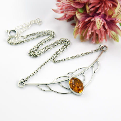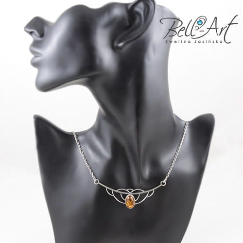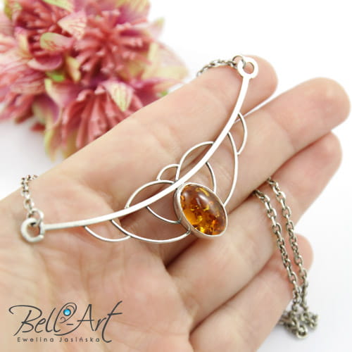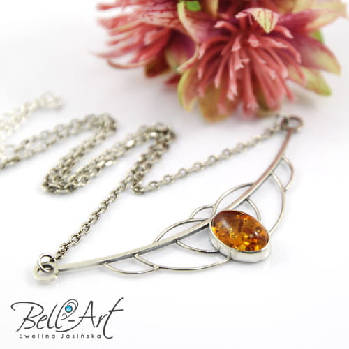Subtelny naszyjnik, wykonany ręcznie ze srebra próby 925 i 999 oraz bursztynu. Naszyjnik ma ażurową formę i zawieszony jest na delikatnym łańcuszku. Bursztyn ma ciepły, słoneczny odcień, a z tyłu oprawy wycięty jest otwór przez który przechodzi światło. Całe srebro zostało bardzo delikatnie przyciemnione i wypolerowane na połysk. Naszyjnik ma ciekawą formę, przyciąga wzrok, a zarazem jest elegancki. Przypadnie do gustu Paniom lubiącym stylowe i niepowtarzalne ozdoby.