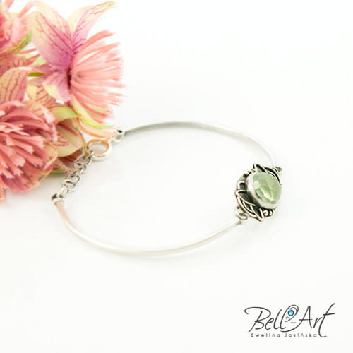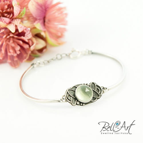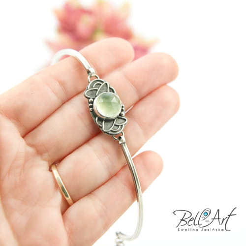 Delikatna i finezyjna bransoletka wykonana ręcznie. Jej główną ozdobą jest szlifowany prehnit (frenit) , który otaczają misterne, srebrne wzory.