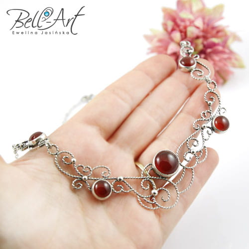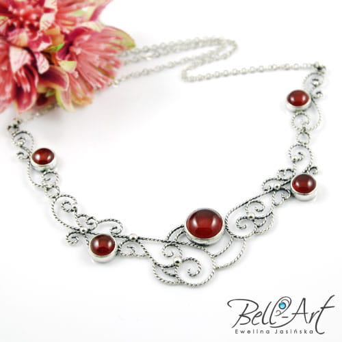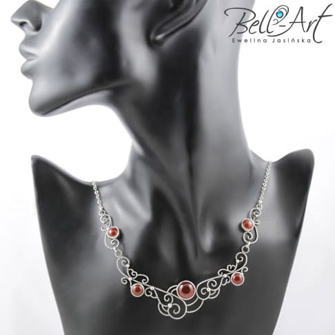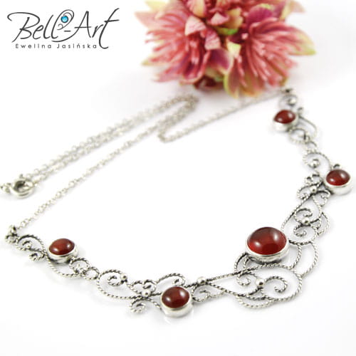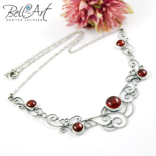 Ekskluzywny naszyjnik z nutką romantyzmu. Jest on wykonany w całości ręcznie ze srebra pr. 925 i 999 i ozdobiony karneolami w dwóch rozmiarach. Naszyjnik ma formę misternie zwijanych i połączonych ze sobą ornamentów. Całość składa się z elementu głównego oraz dwóch dodatkowych elementów dołączonych do łańcuszka. Srebro zostało lekko przyciemnione (zoksydowane) i wypolerowane na połysk. Dla osób wolących mniejsze naszyjniki mogę zaproponować odłączenie 2 górnych elementów ozdobnych (po dodaniu bigli świetnie sprawdzą się jako kolczyki). Istnieje też możliwość wykonania naszyjnika z innym kamieniem. Czas i koszt ustalany indywidualnie.