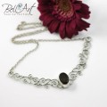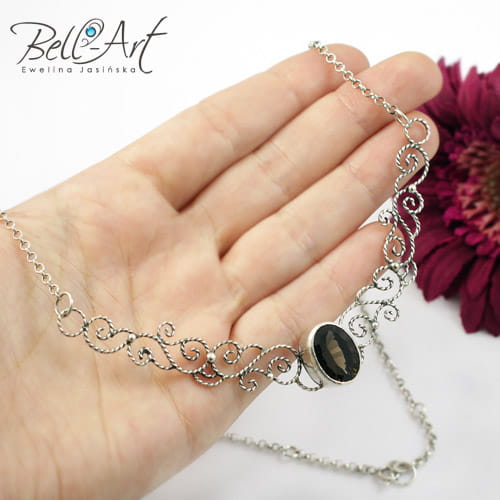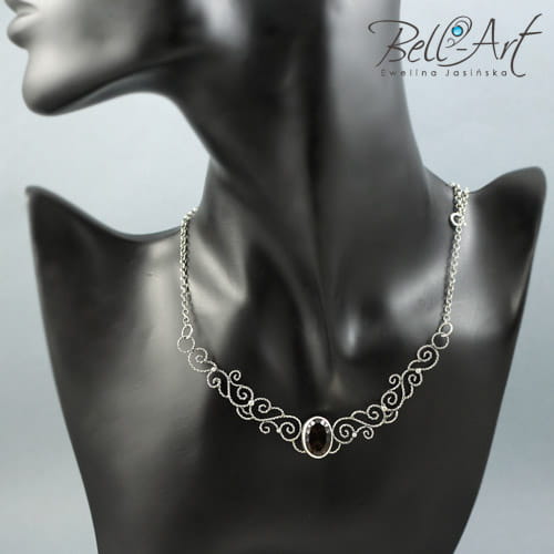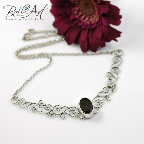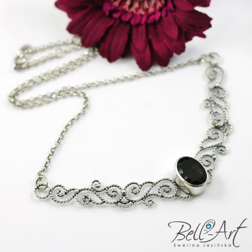 Wyjątkowy naszyjnik wykonany ręcznie ze srebra próby 925 i 999. Ozdobiony fasetowanym kwarcem dymnym o pięknym szlifie. Kamień został umieszczony po środku misternych, spiralnych ornamentów, które tworzą niepowtarzalny i kobiecy wzór. Srebro jest lekko zoksydowane (przyciemnione) i wypolerowane na połysk. Cały element dekoracyjny zawieszony jest na dobranym łańcuszku o regulowanej długości. Naszyjnik podkreśli i dopełni każdy wieczorowy strój.