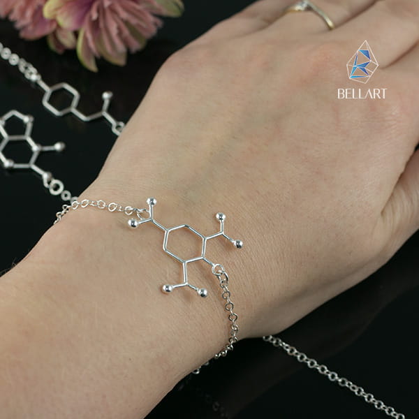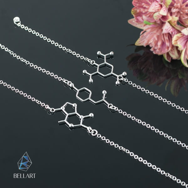 Srebrne cząsteczki paracetamol, TNT i teobromina. W komplecie znajdują się dwie srebrne bransoletki oraz naszyjnik.