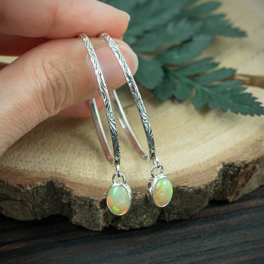 - kolczyki: opal 6x8 mm, średnica koła ok. 3-3.5 cm, szerokość 2 mm.