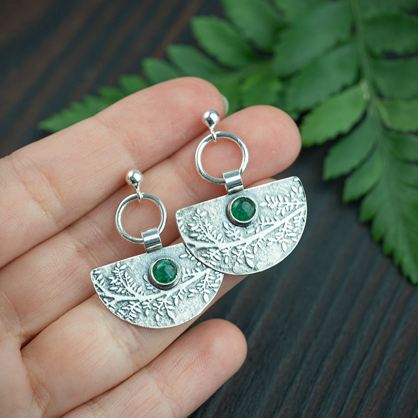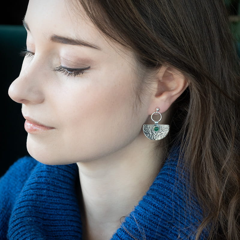 Oryginalne kolczyki w kształcie półkola, z listkami i awenturynem. Jest to bardzo ciekawa biżuteria, która wyróżni cię z tłumu. Kolczyk jest skonstruowany w taki sposób, że półkola ruszają się, w momencie noszenia ich. Powierzchnie srebra zdobi delikatny, roślinny wzór w postaci listków. Dodatkowo, w środku tego elementu znajduje się oczko z zielonym awenturynem, które nadaje kolczykom dodatkowego uroku. Piękna biżuteria, która z pewnością wyróżni cię z tłumu. Dzięki temu, że biżuteria wykonana jest ze srebra, ma ona stosunkowo nieformalny charakter, pozwalający na noszenie jej na co dzień. Jeżeli jesteś artystyczną duszą, to te kolczyki idealnie będą współgrały z twoim charakterem i temperamentem. Ozdobę możesz nosić przy spiętych włosach. Pozwoli to na lepsze wyeksponowanie kolczyków, które z pewnością będą zwracały uwagę otoczenia.