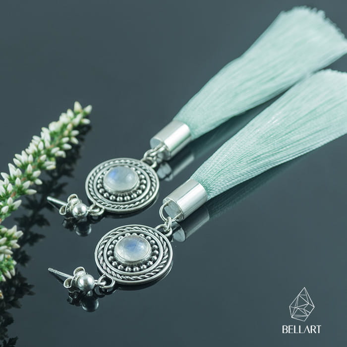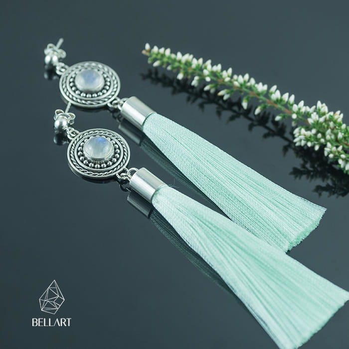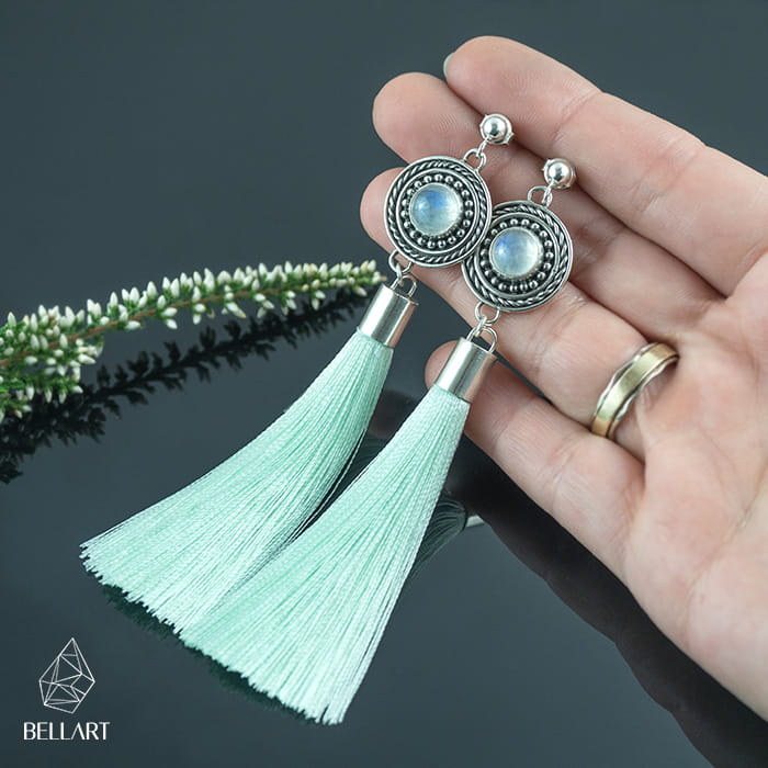 Wyjątkowe i eleganckie kolczyki wykonane ręcznie ze srebra. Kolczyki zdobi piękny kamień księżycowy o błękitnej poświacie, który otoczony jest misternymi zdobieniami. Pod nimi znajduje się piękny miętowy chwost. Całość srebra jest lekko przyciemniona i wypolerowane na połysk tak aby podkreślić wzory. Kolor chwostów oraz kamieni idealnie się uzupełniają. Srebrne kolczyki z chwostami idealnie sprawdzą się na wyjątkowe okazje, wieczorne wyjścia lub gdy po prostu chcesz włożyć coś niepowtarzalnego. Ten kobiecy,lekko orientalny dodatek wyróżni Cie wśród innych.