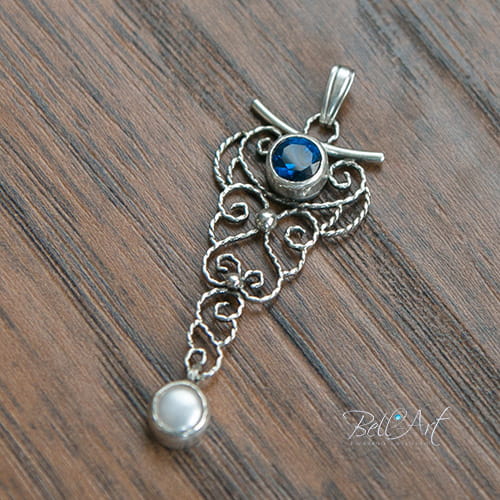Materiał: srebro pr. 925 i 999, naturalne perły hodowlane, szafirowe cyrkonie.