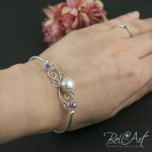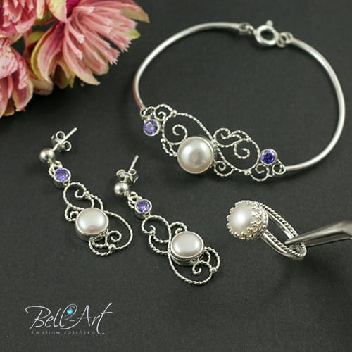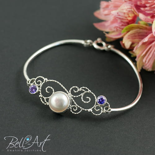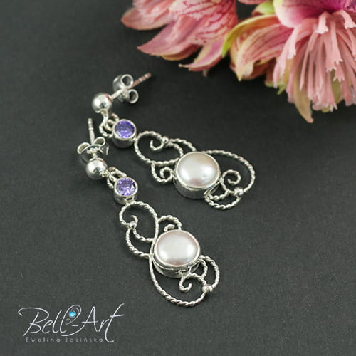 Komplet biżuterii ślubnej, który został wykonany ręcznie ze srebra i ozdobiony naturalnymi perłami hodowlanymi i cyrkoniami w kolorze ametystowym. Gładkie srebro łączy się w nim z ozdobnymi, spiralnymi zawijasami. Całość wypolerowana na połysk. Komplet jest elegancki i romantyczny, idealny do ślubnych stylizacji.