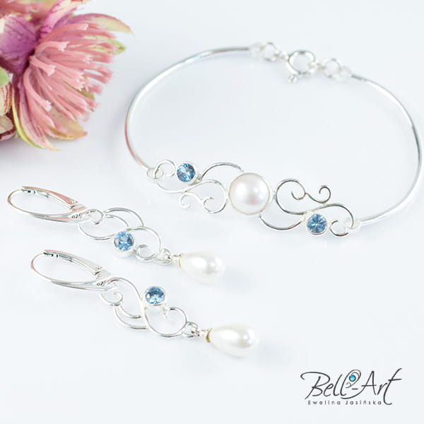 Biżuteria ślubna wykonana ręcznie z jasnego, polerowanego srebra. Komplet ozdobiony jest białymi perłami i połyskującymi cyrkoniami w pięknym błękitnym odcieniu. Całość tworzy subtelny i elegancki dodatek. Stanowi idealne dopełnienie ślubnej kreacji.
