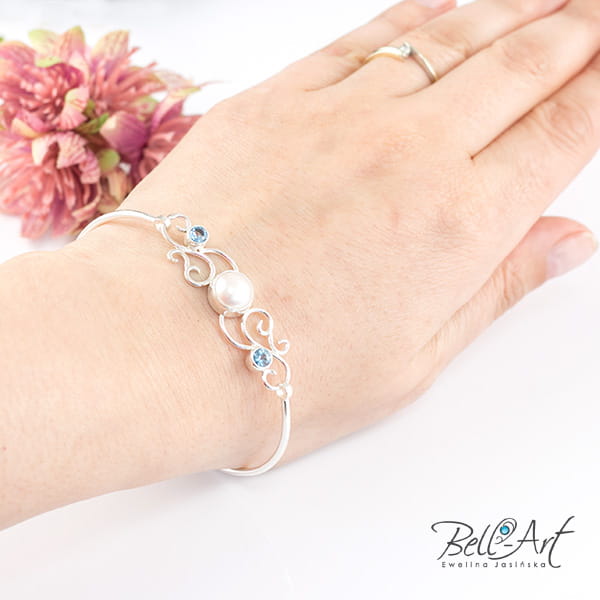 Materiały: perła naturalna hodowlana, perły seashell, cyrkonie błękitne, srebro pr. 925 i 999.