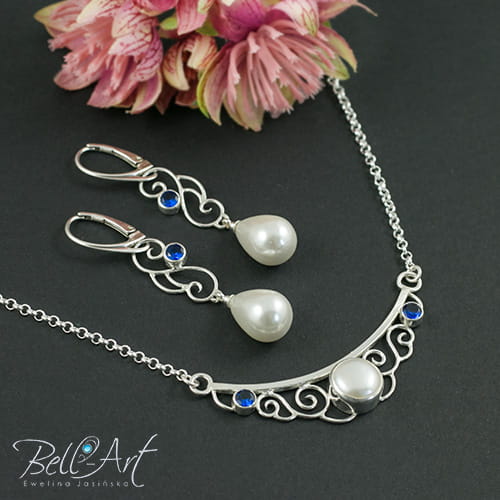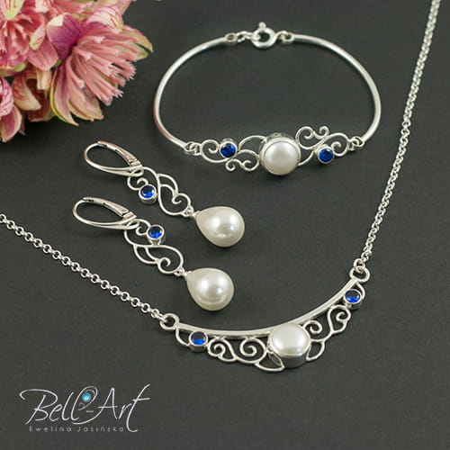 Biżuteria wykonana ręcznie z jasnego, polerowanego srebra. Całość ozdobiona jest białymi perłami i połyskującymi cyrkoniami w pięknym szafirowym odcieniu. Komplet jest subtelny i elegancki. Stanowi idealne dopełnienie ślubnej kreacji.