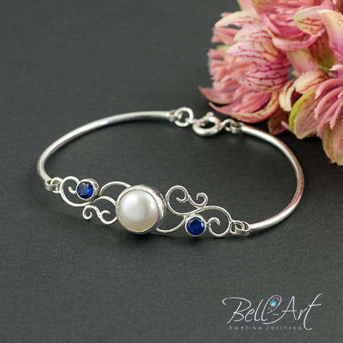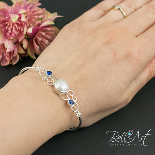 Materiały: perły naturalne hodowlane, cyrkonie szafirowe, srebro pr. 925 i 999.