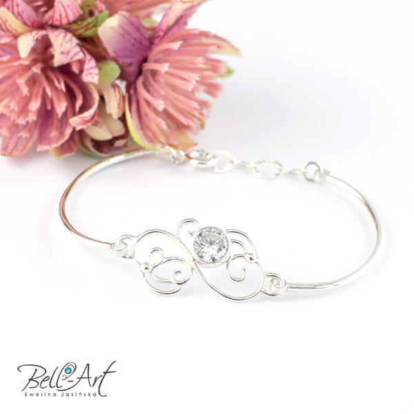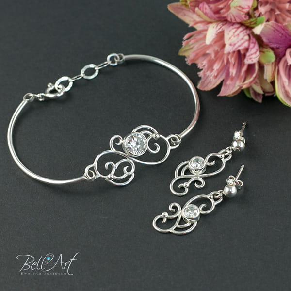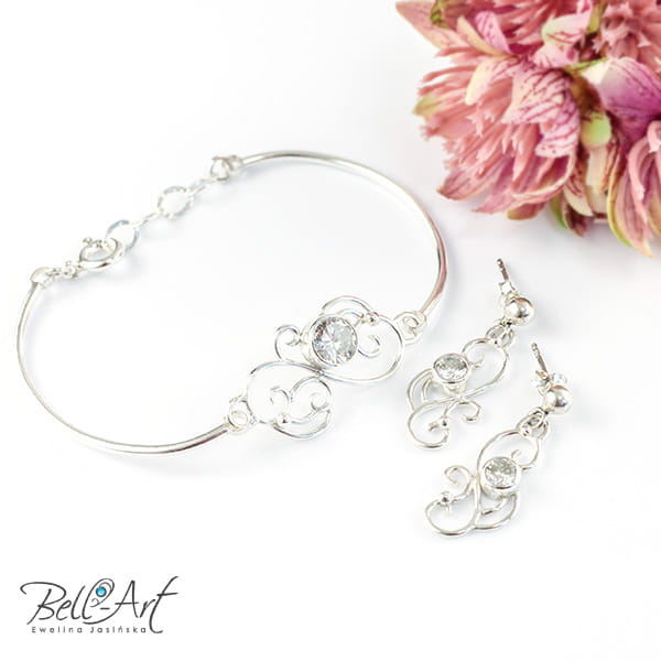 Biżuteria ślubna wykonana ręcznie z jasnego, polerowanego srebra. Główną ozdobą są tu połyskujące cyrkonie w pięknym brylantowym szlifie. Całość tworzy subtelny i elegancki dodatek. Komplet biżuterii idealne dopełni ślubną kreację.