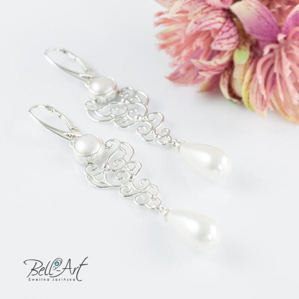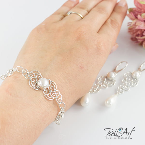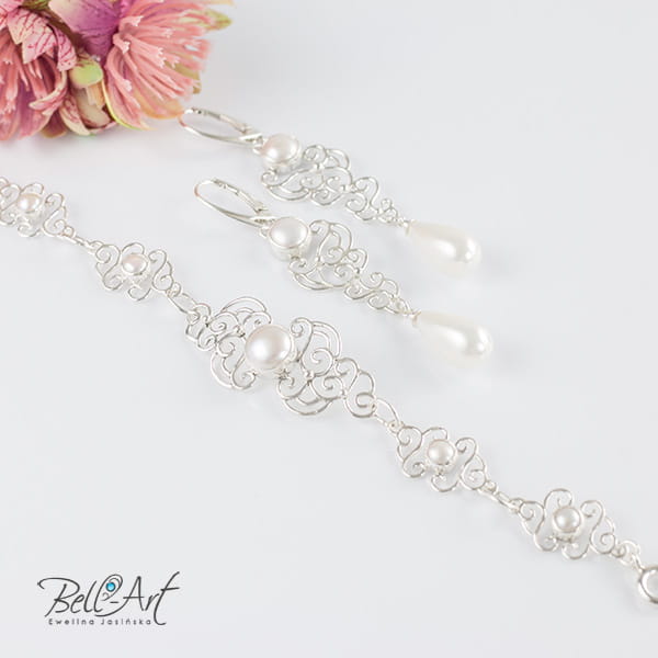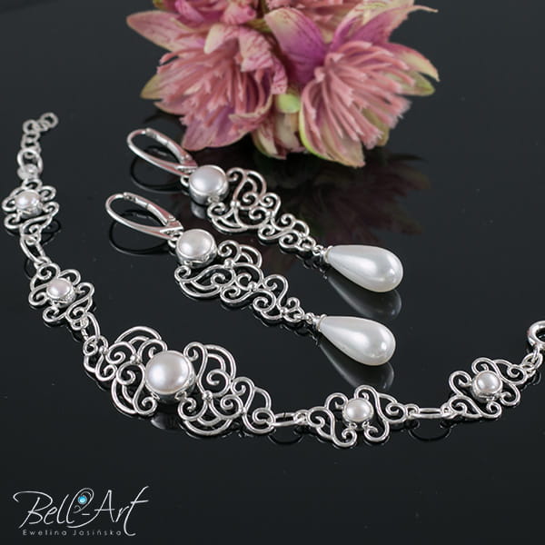 Srebrny komplet ślubny ozdobiony naturalnymi perłami hodowlanymi oraz perłami seashell. Ma on delikatną, ażurową formę. Dłuższe kolczyki pięknie wysmuklają szyję, a dopasowana do nich bransoletka subtelnie podkreśla nadgarstek.