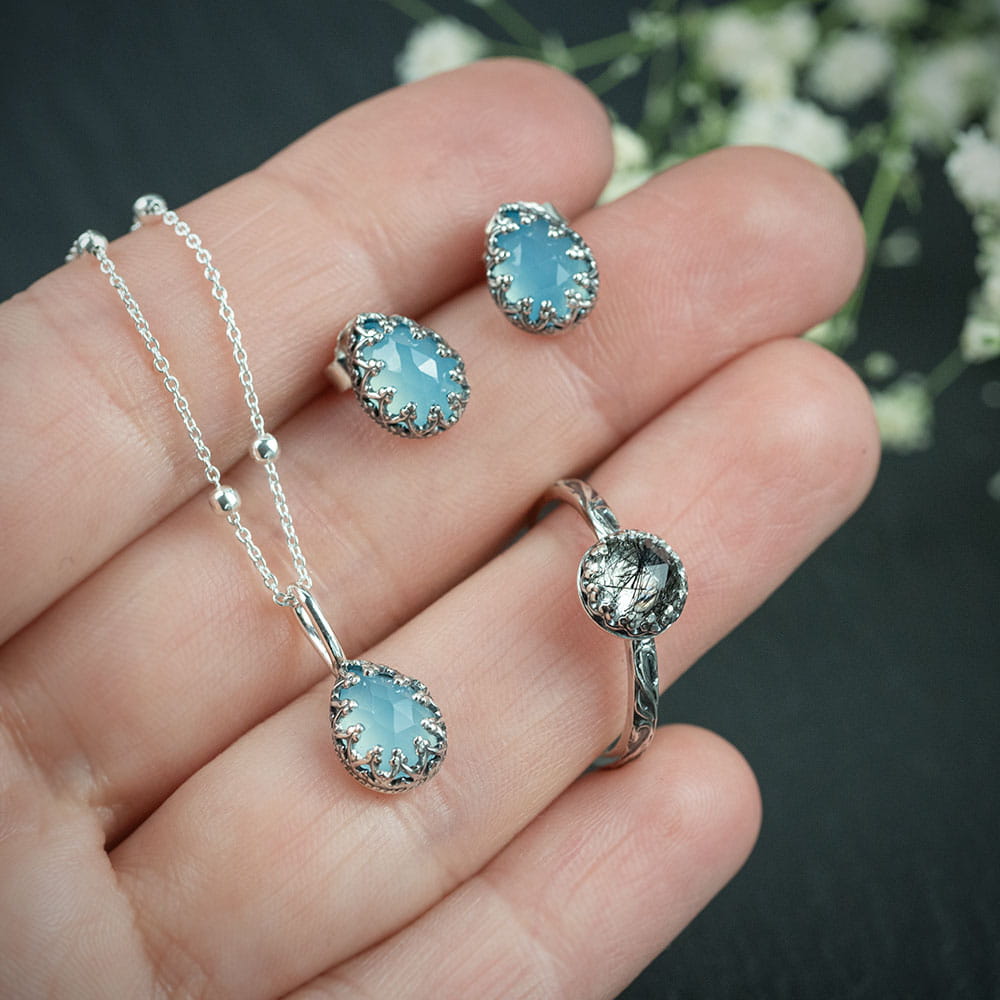 Komplet z błękitnym chalcedonem i pierścionek z kwarcem z turmalinem