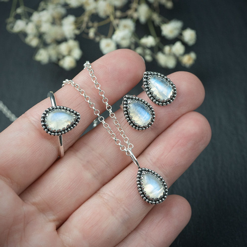 Komplet z kamieniem księżycowym w ażurowej oprawie na zamówienie