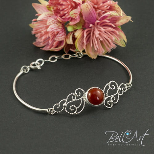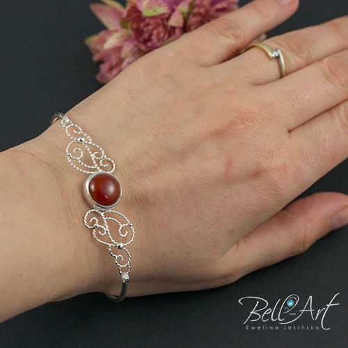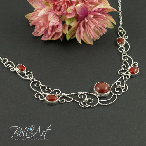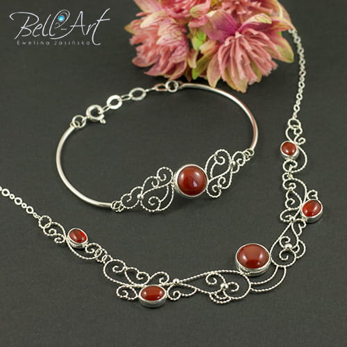 Biżuteria wykonana ręcznie specjalnie dla mamy Panny Młodej. Komplet ozdobiony został karneolem w różnych rozmiarach, który wkomponowany jest między misterne zawijasy. Srebro zostało wypolerowane na połysk. Całość tworzy piękną i niepowtarzalna ozdobę.