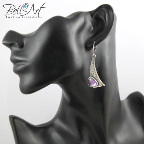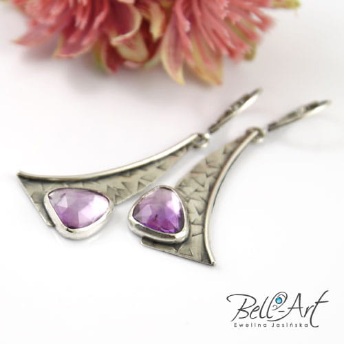 Wyjątkowe kolczyki wykonane ręcznie ze srebra. Dekoracyjny element pokryty jest ręcznie wykuwaną fakturą i ozdobiony fasetowanym ametystem w lawendowym odcieniu. Srebro zostało delikatnie przyciemnione i wypolerowane na połysk. Kolczyki te mają nowoczesną, lekko geometryczną formę. Idealnie sprawdzą się zarówno przy klasycznych jak i awangardowych stylizacjach.