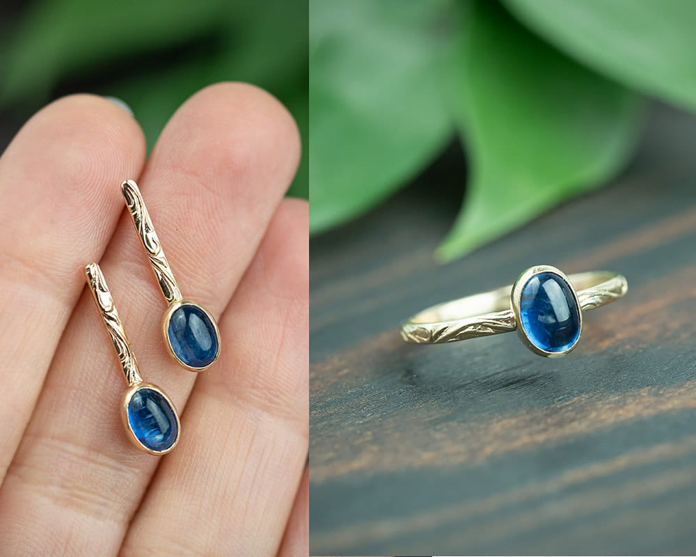 Wymiary: kyanit 7x5 mm, długość całkowita 2 cm, szerokość1.8 mm.