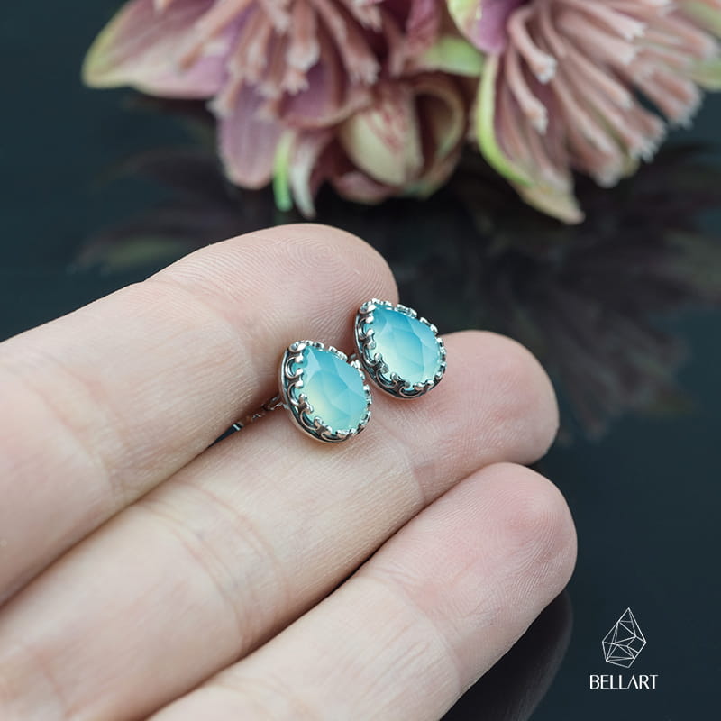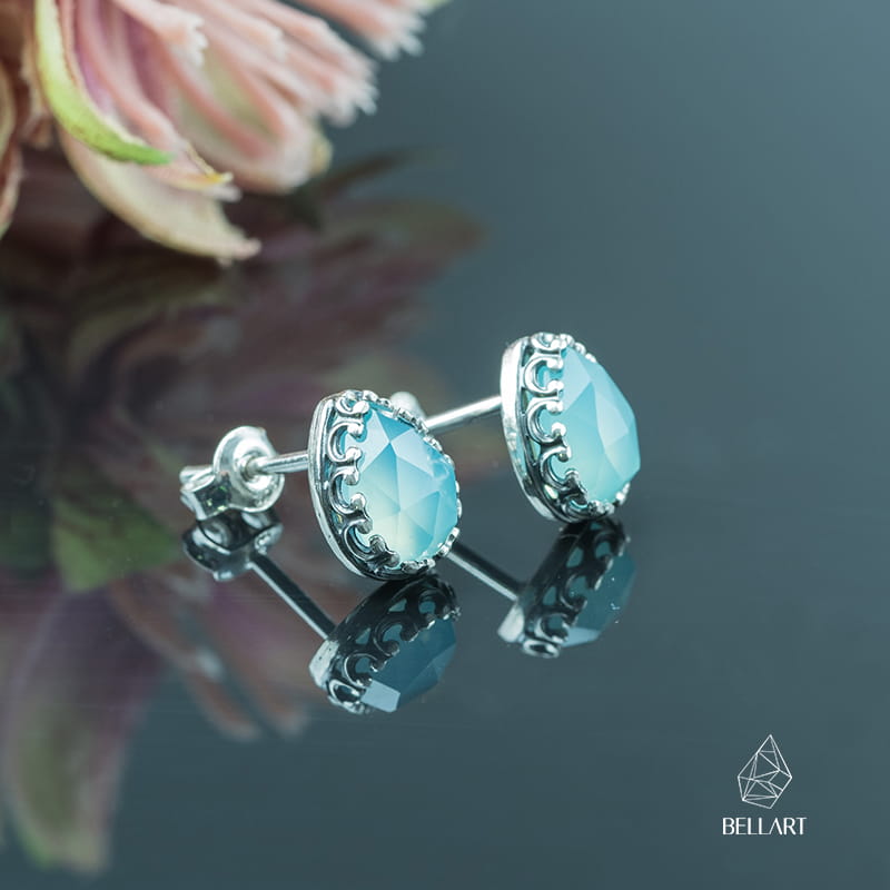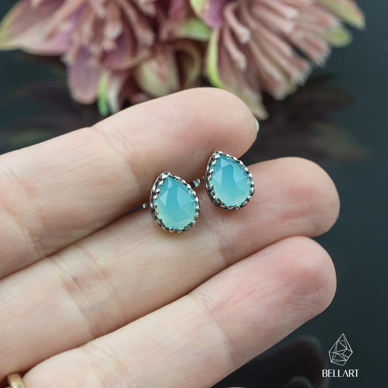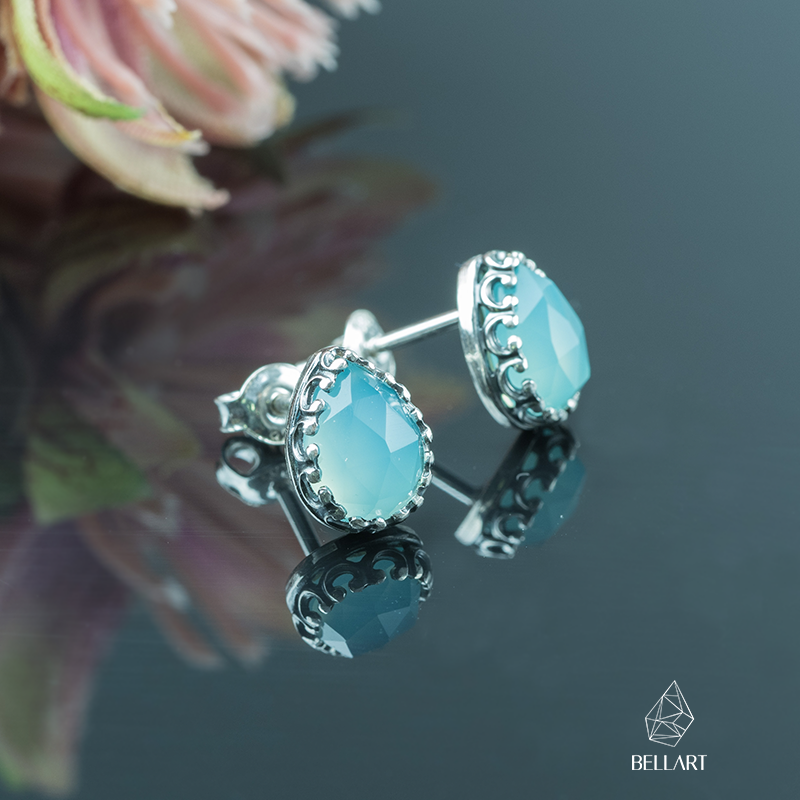 Urocze i delikatne sztyfty wykonane ręcznie ze srebra. Główną ozdobą tych srebrnych kolczyków jest piękny chalcedon, który otoczony jest ażurową oprawą. Ma on delikatny szlif zwany rose cut i błękitno-miętową barwę. Sztyfty świetnie sprawdzą się jako biżuteria na co dzień. Delikatna koronkowa oprawa nadaje im nieco romantycznego charakteru, a pastelowy kolor sprawia, że nie są krzykliwe. Pięknie wpasują się w stylizacje biurowe jak i codzienny np. letni ubiór. Jeśli szukasz biżuterii eleganckiej i subtelnej, a zarazem niebanalnej te srebrne sztyfty będą idealne. Seria drobnych sztyftów z kamieniami jubilerskimi i perłami jest już od kilku lat najchętniej zamawianym produktem z mojej pracowni.