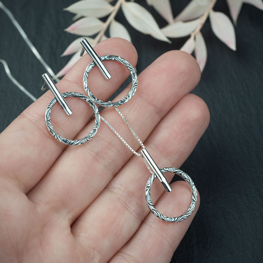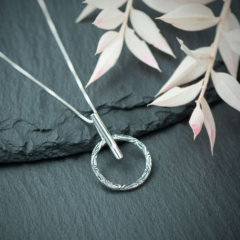 Minimalistyczny srebrny naszyjnik w kształcie koła ze zdobieniami flora