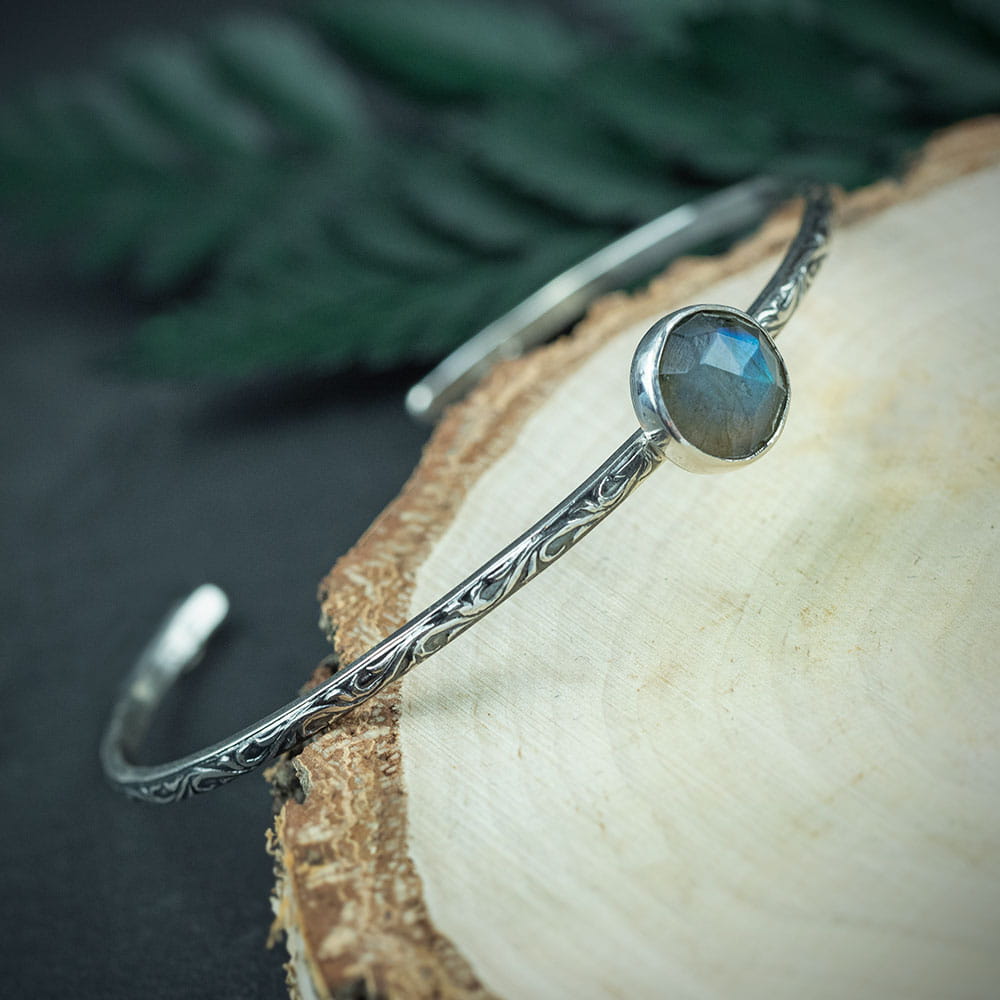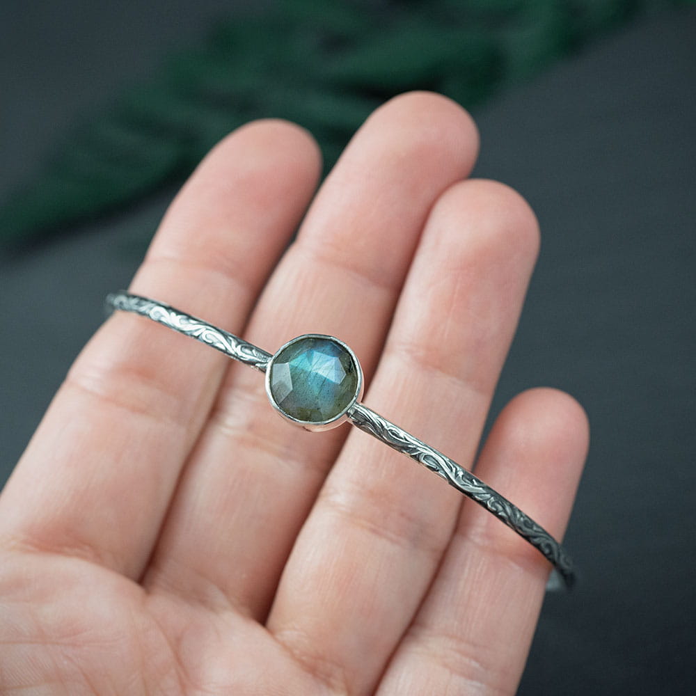 Owalna bransoleta z delikatnymi ornamentami ozdobiona fasetowanym niebieskim labradorytem