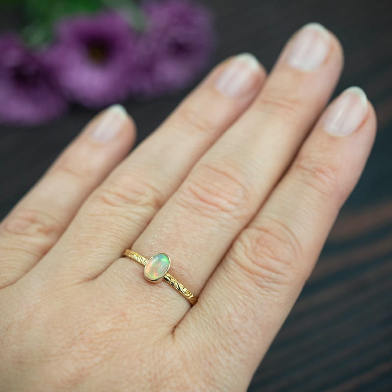Subtelny złoty pierścionek z owalnym opalem etiopskim i ozdobną obrączką