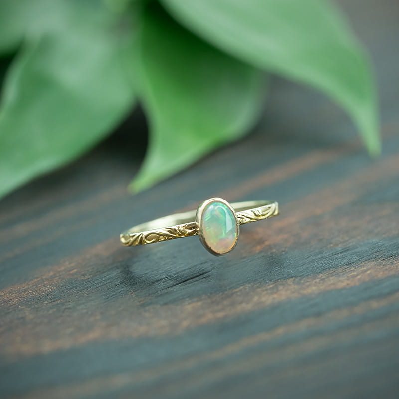 Megan - złoty pierścionek z opalem etiopskim i zdobioną obrączką