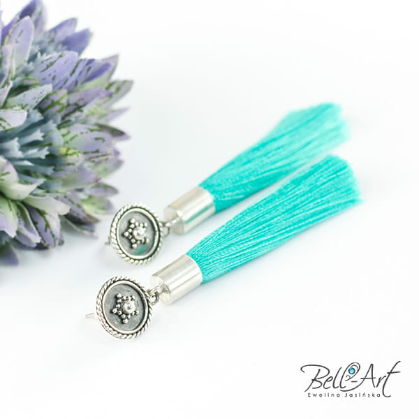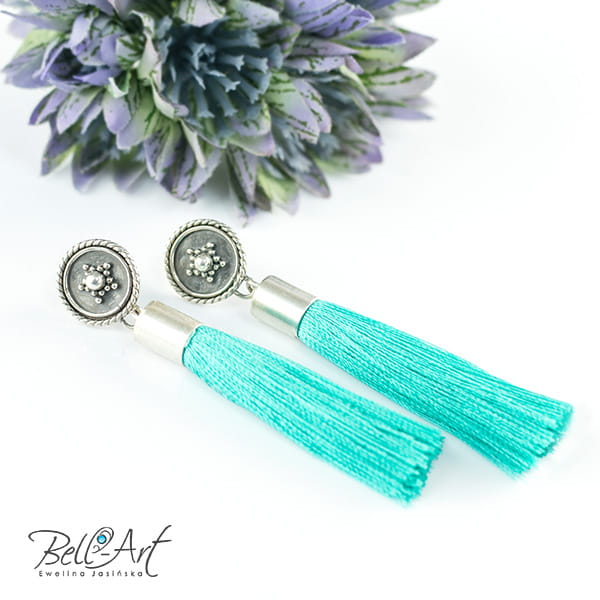 Oryginalne srebrne kolczyki w stylu boho. Wykonane są ręcznie ze srebra i ozdobione satynowym chwostem w pięknym morskim kolorze. Kolczyki są lekkie i zwiewne. Doskonale prezentują się z letnimi stylizacjami, a dzięki swojej długości pięknie wysmuklają szyję. Srebro w kolczykach zostało lekko przyciemnione i wypolerowane na połysk. Nietuzinkowy kolor satynowych chwostów będzie pięknie pasował zarówno do "małej czarnej" jak i wielu innych barw.