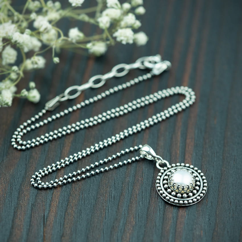 Srebrny wisior z perłą jest subtelną ozdobą, która znakomicie podkreśli kobiecą urodę. Dominującym motywem są tu drobne kuleczki , które znajdują się dookoła perły jak i w dopasowanym łańcuszku. Naszyjnik z perłą znakomicie sprawdzi się w charakterze eleganckiej i dyskretnej ozdoby stroju biznesowego, ale dzięki uniwersalności wzoru, możesz nosić okrągły wisior z perłą, kiedy tylko zechcesz. Efektownie upiększy Twój dekolt podczas wielu bardziej i mniej oficjalnych okazji. Łańcuszek pozwala na wygodną regulację długości, dlatego bez trudu dopasujesz go do swoich preferencji. Naturalna perła hodowlana prezentuje się wyjątkowo w srebrnej oprawie a okręgi pieczołowicie ułożone z maleńkich kuleczek, wydobywają wszystkie jej walory. Do kompletu możesz zamówić też pierścionek ozdobiony tym samym motywem, co przywieszka.Obydwa drobiazgi Tworzą idealnie dobrany duet.