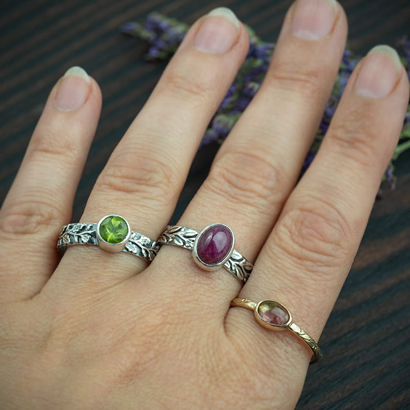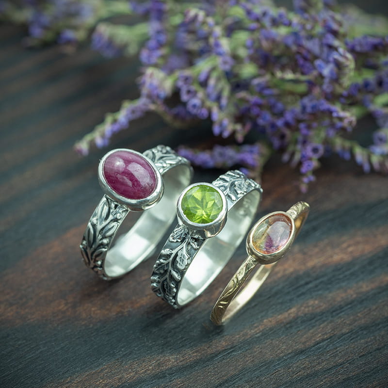 Każdy z pierścionków posiada inny, roślinny motyw na obrączce oraz wyjątkowy kamień: turmalin oraz przesłane przez klientkę rubin i oliwin.