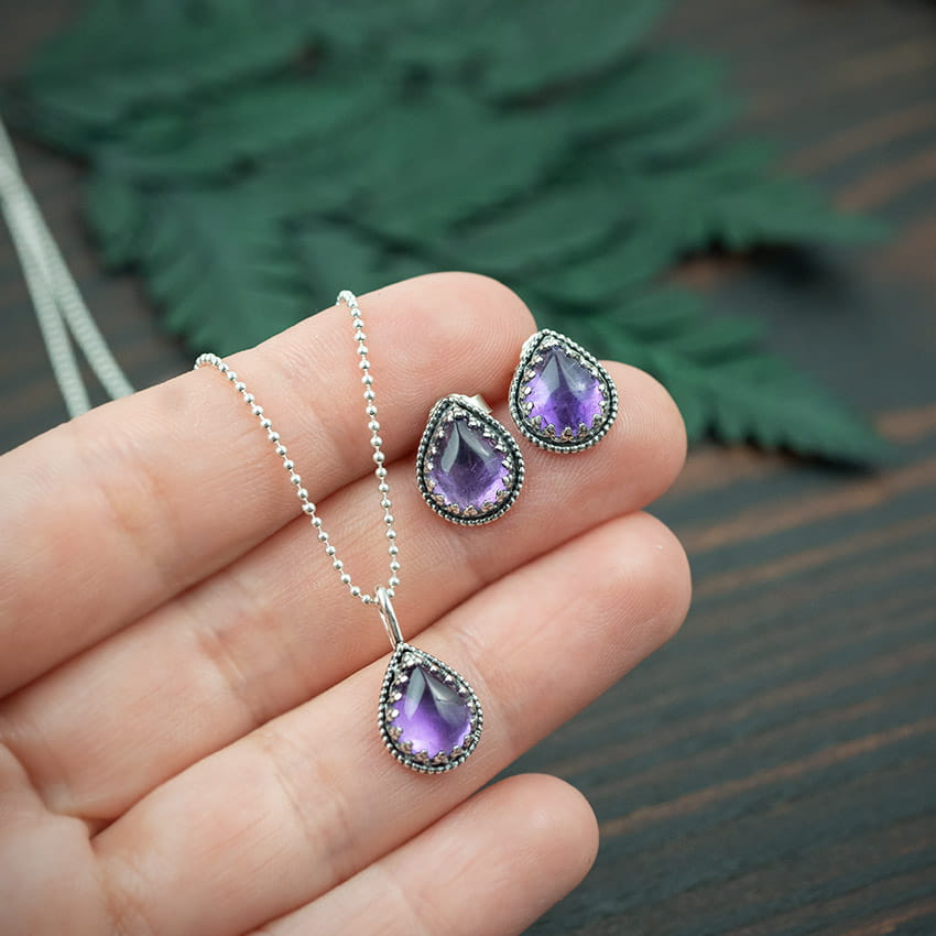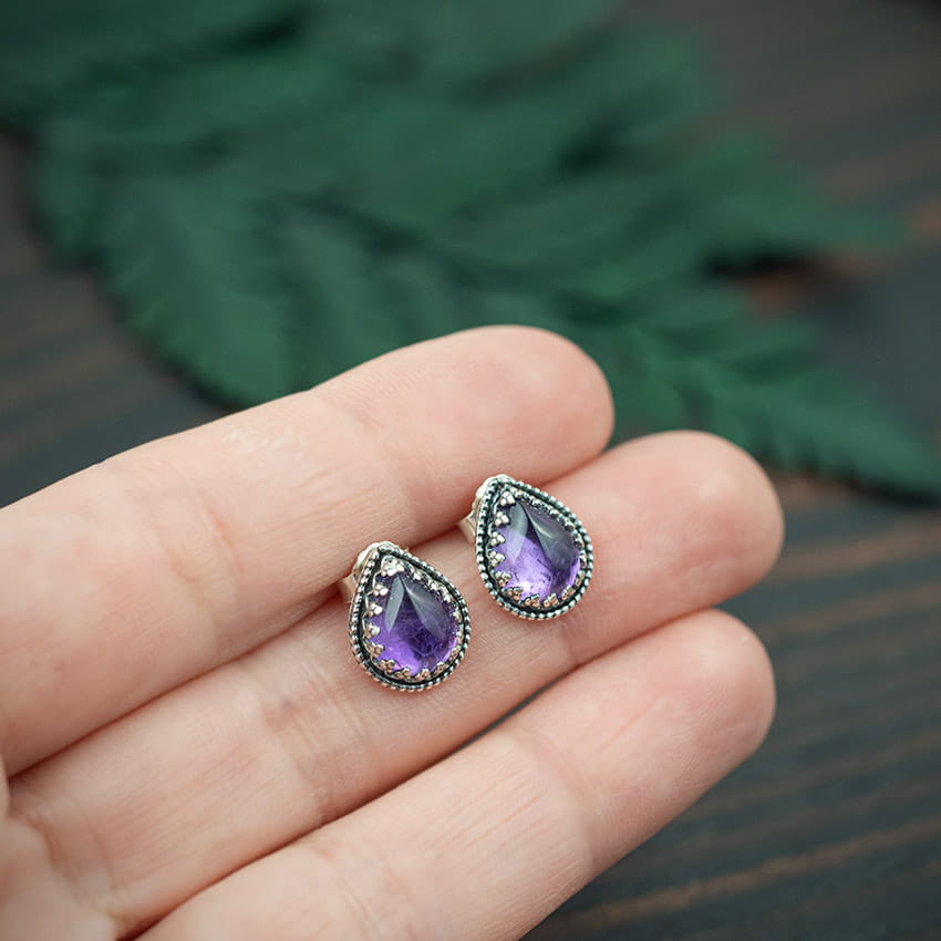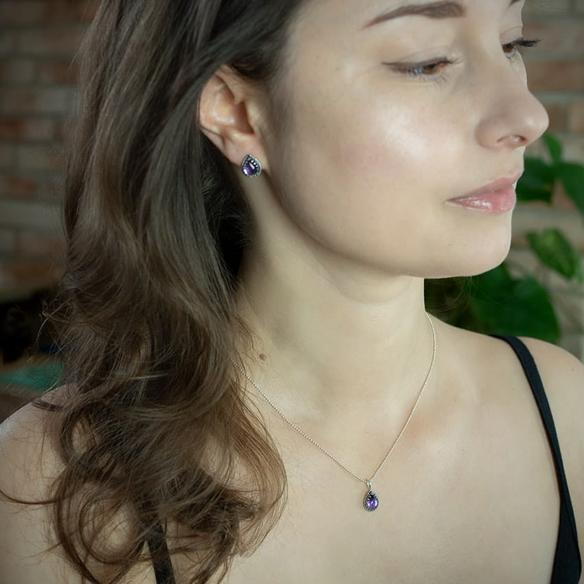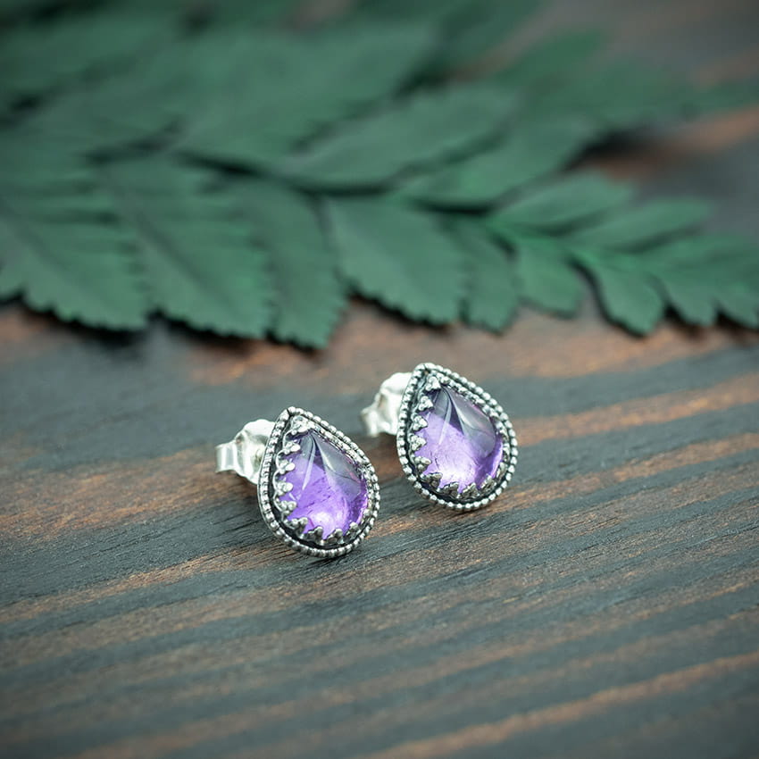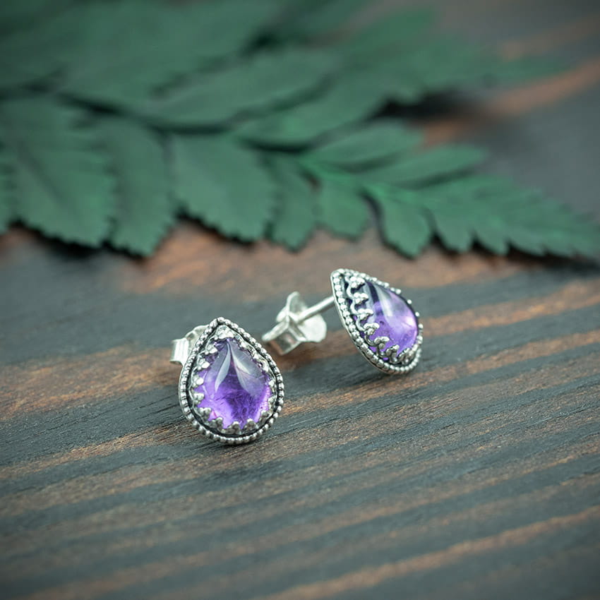Piękne i kobiece kolczyki z ametystem, wykonane w technikach złotniczych. Zdobi je kamień w głębokim fioletowym kolorze. Całość srebra została przyciemniona w zagłębieniach i wypolerowana na połysk. Dzięki temu kolczyki mają nieco tajemniczy i elegancki charakter. Jeśli szukasz subtelnej biżuterii, która zrobi wrażenie zarówno na co dzień jak i na większe wyjścia - te kolczyki z ametystem będą świetnym wyborem.