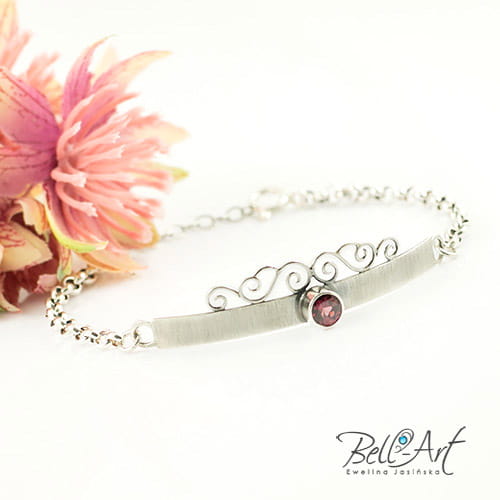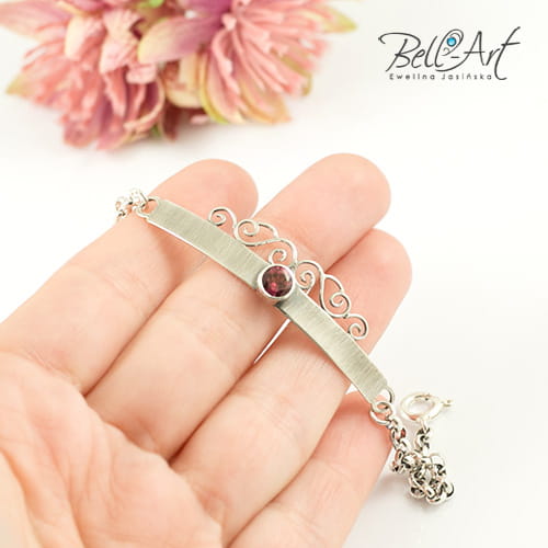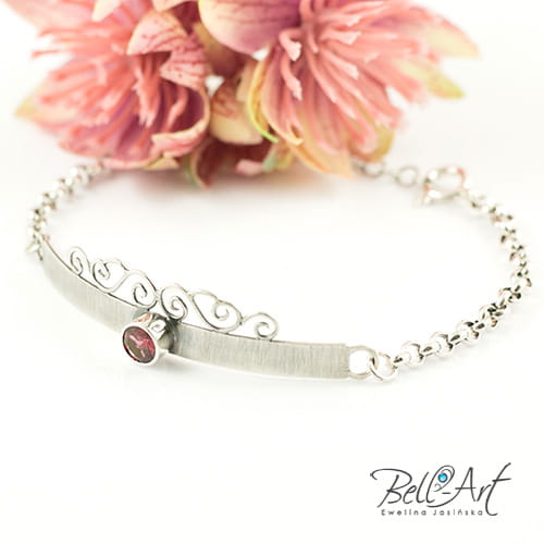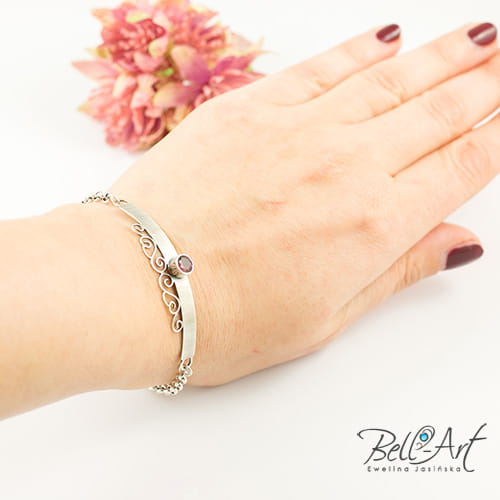 Subtelna i kobieca bransoletka wykonana ręcznie ze srebra. Zdobi ją piękny, fasetowany rodolit, który umieszczony jest na zdobionej blaszce. Całość dopełnia łańcuszek. Srebro zostało lekko przyciemnione i wypolerowane. Bransoletka jest stylowa i elegancka, wyjątkowo prezentuje się na ręce.