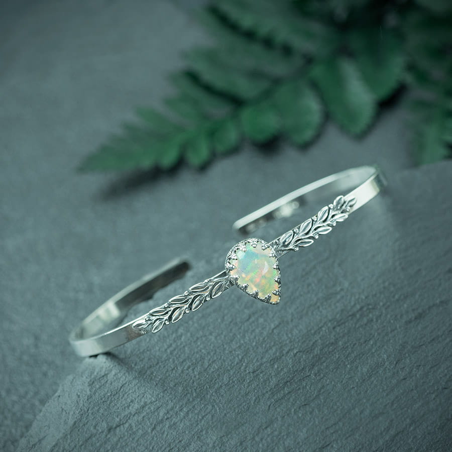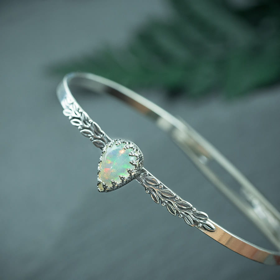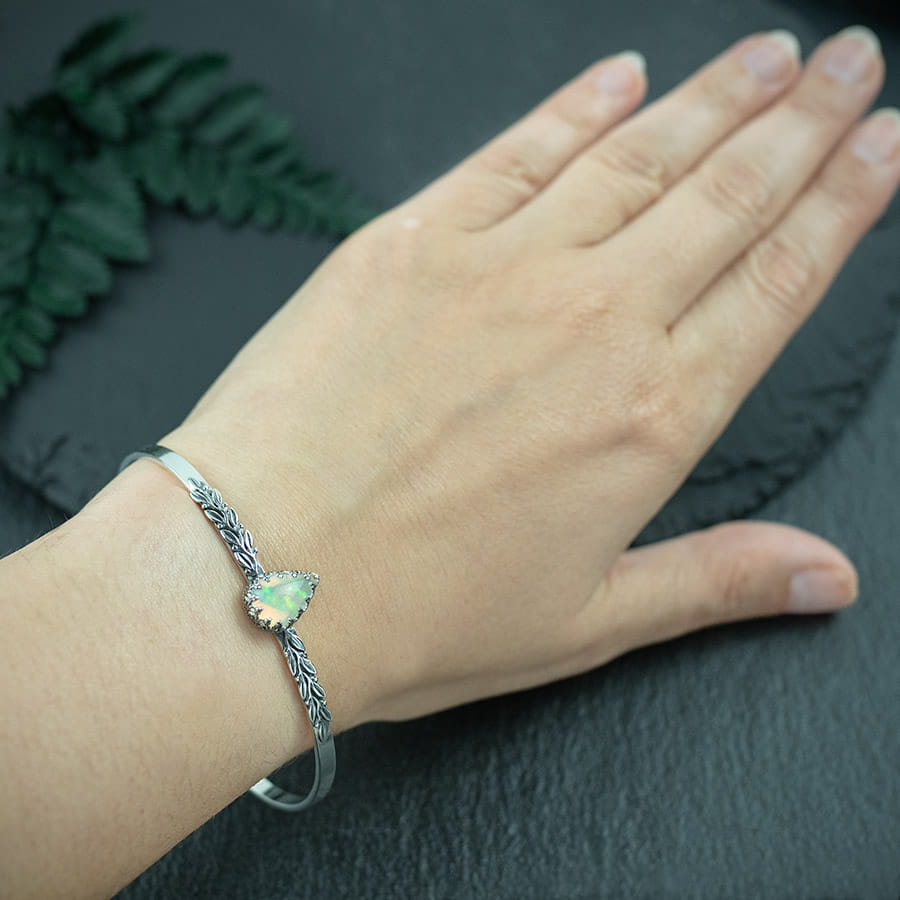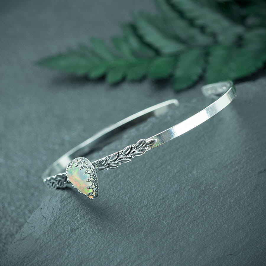 Siya - srebrna owalna bransoleta z opalem i listkami