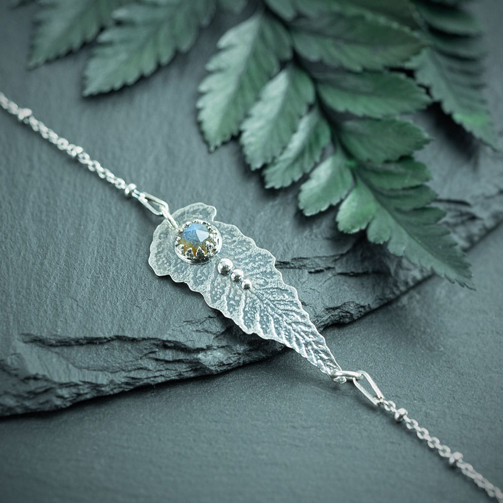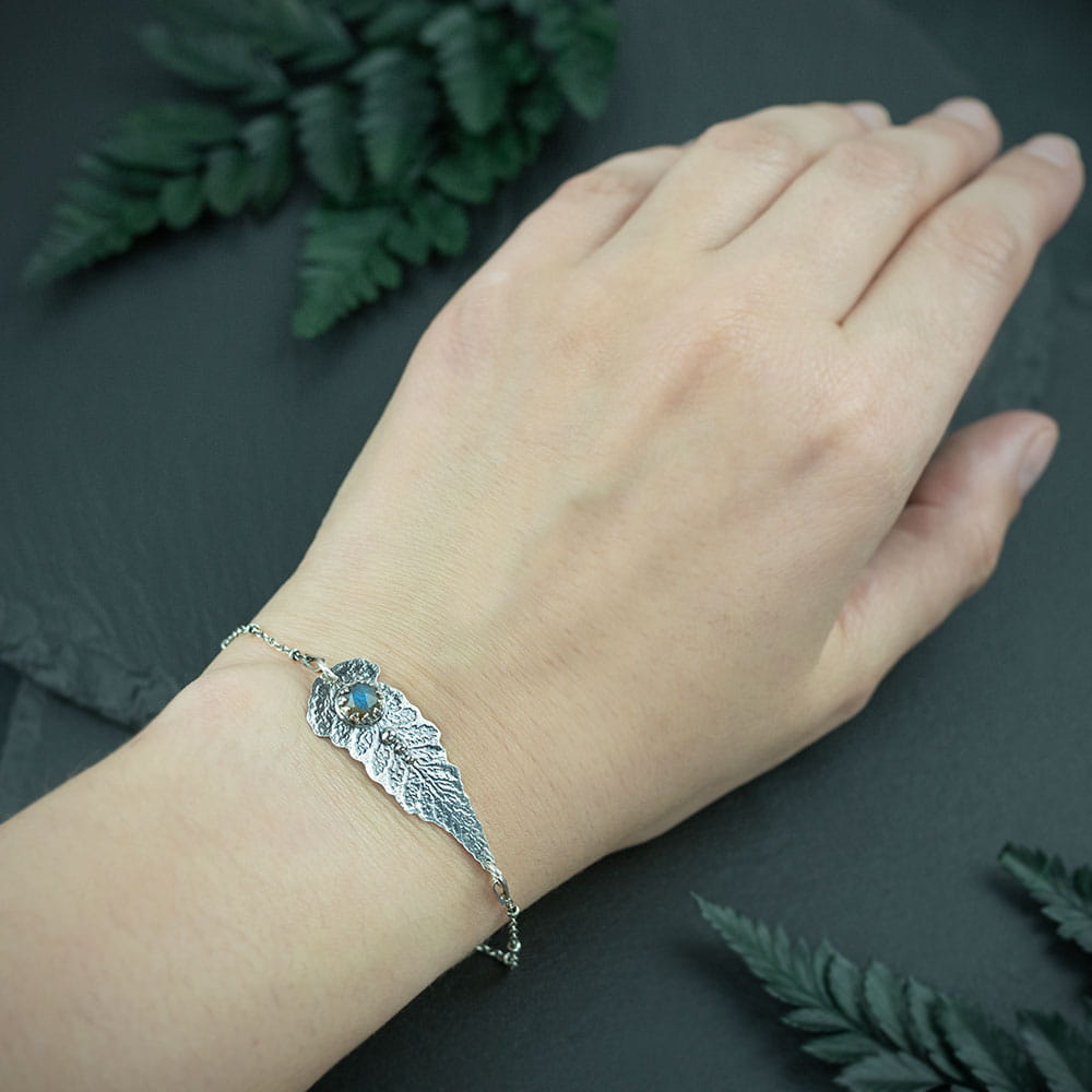Ten model bransoletki z liściem paproci dopełniony jest ozdobnym łańcuszkiem, który wygodnie dopasowuje się do nadgarstka. Kształt liścia wzorowany jest na naturalnym liściu paproci. Dodatkową ozdobą jest wyjątkowy labradoryt o niebieskim połysku. Całość delikatnie przyciemniłam w zagłębieniach i wypolerowałam na połysk, dzięki temu wzory są pięknie podkreślone.