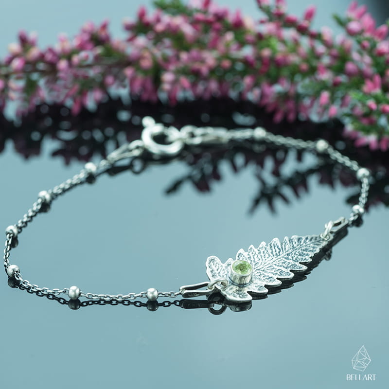 Srebrna bransoletka liść paproci z perydotem