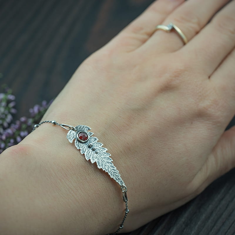 Srebrna bransoletka liść paproci w granatem. Jest to subtelny dodatek, który idealnie podkreśli wiele kreacji. Srebrny liść paproci jest pomniejszonym odwzorowaniem naturalnego liścia. Dodatkową ozdobą jest fasetowany granat w kolorze czerwonego wina i drobne kuleczki. Bransoletka uzupełniona jest o łańcuszek, który wzorem dopasowany jest do całości. Liść paproci spodoba się osobom lubiącym naturalne i roślinne wzory. Dzięki delikatnemu łańcuszkowi bransoletka jest subtelna i wygodna w noszeniu. Możesz też regulować jej długość. Każdy element tej bransoletki z granatem powstał przy użyciu technik złotniczych, z dbałością o każdy szczegół.