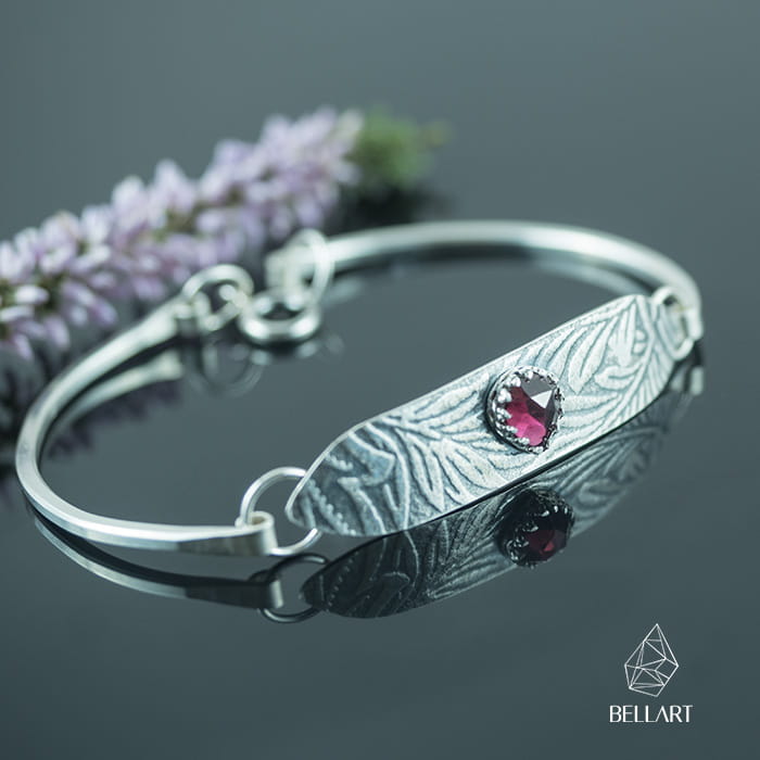 Efektowna bransoletka wykonana ręcznie ze srebra. Ma ona postać ozdobnej blaszki w centrum której umieszczony jest granat. Kamień ma piękny fasetowy szlif zwany rose cut i kolor czerwonego wina. Srebro zostało lekko przyciemnione aby podkreślić wzory i wypolerowane na połysk. Srebrna bransoletka z motywem liści jest bardzo modnym dodatkiem. Dzięki ruchomym ramionom wygodnie dopasujesz ją do nadgarstka, a oryginalne wzory i fasetowany granat sprawią, że będziesz posiadać coś niepowtarzalnego. Bransoletka świetnie sprawdzi się jako ozdoba do pracy czy na co dzień.