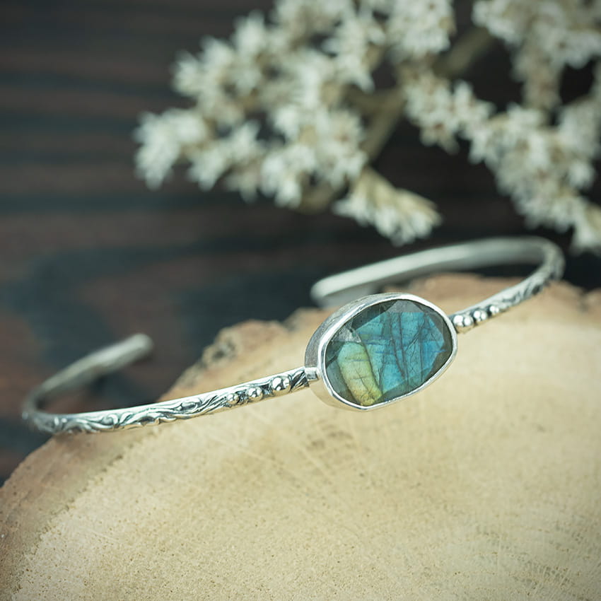 Srebrna bransoletka typu bangla z labradorytem i roślinnym wzorem