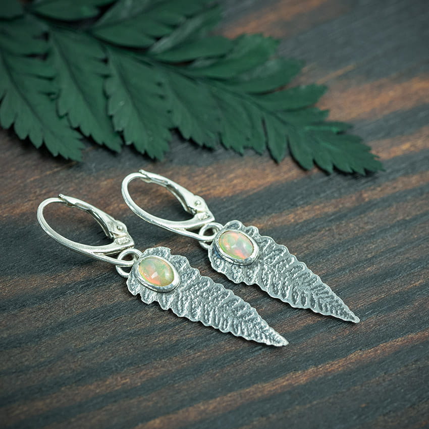 Paproć jest tajemniczą, rośliną, choć nie ma kwiatów, wielu ich poszukiwało. Srebrne kolczyki liść paproci z opalem podkreślą twój unikatowy styl i kto wie, może we właściwym czasie pomogą Ci rozkwitnąć.