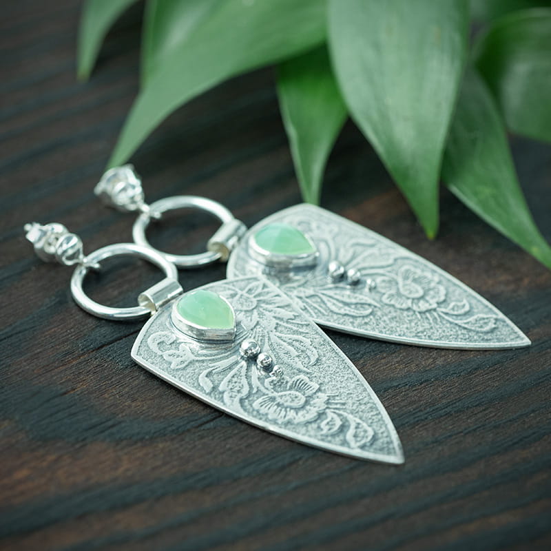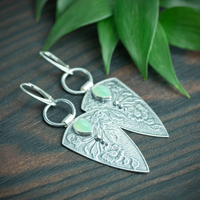 Oryginalne kolczyki w kształcie trójkątów ozdobione miętowym chalcedonem i kwiatowym wzorem
